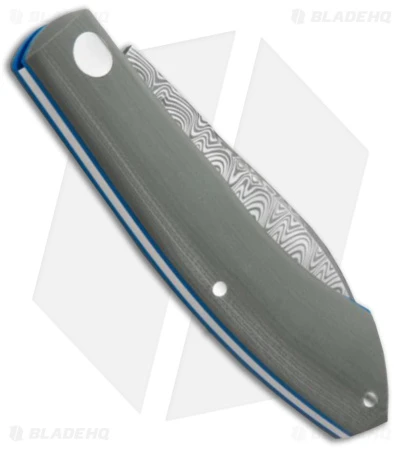 - Gray G-10 handle scales with blue liners.