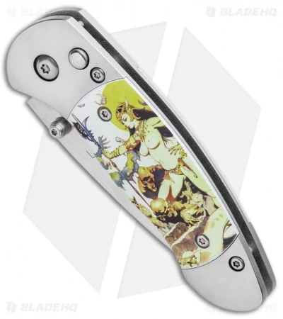This Boker Plus Gordito features Frank Frazetta’s “Ghoul Queen” on the handle. The blade is made from stonewashed 440C stainless steel. It’s built with titanium liners and bolsters, and a secure a plunge lock mechanism.