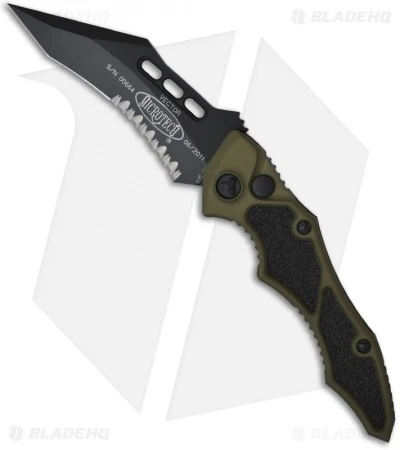 The Vector knife from Microtech has always been a favorite among collectors and has just been revived as a 2011 model! The Microtech Vector automatic knife sports a black DLC S35-VN stainless steel blade with a partially serrated edge. The green anodized aluminum handle has textured grip inserts on front. The frame is tapered front to back with an open build and barrel spacers, very robust! This is the tactical model with all black hardware and pocket clip.