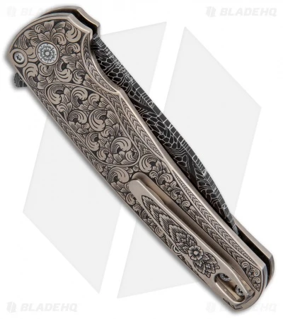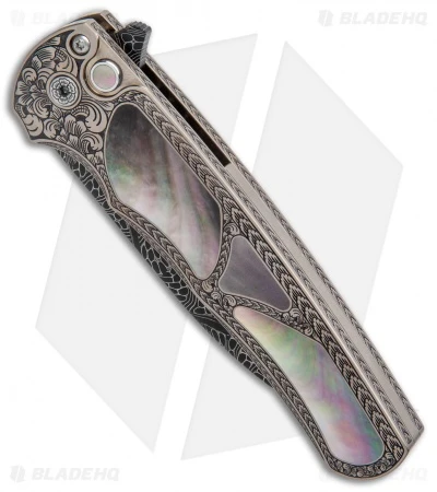 This Ultimate Custom Malibu model has a bronze anodized titanium handle with a full-coverage engraving by Bruce Shaw and presentation-grade black lip pearl inlays; the lock button is matching mother-of-pearl. The blade is “mind meld” Damascus steel by Chad Nichols in a wharncliffe style. In short, the piece is nothing short of stunning.