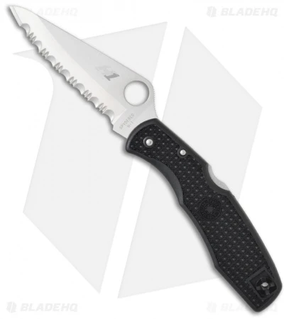 The Pacific Salt knife from Spyderco is built specifically for those that spend time in and around water. It is equipped with a hollow-ground rust-free H-1* blade with a partially serrated edge and satin finish. The handle is black FRN and the internal steel parts are treated making them impervious to rust and pitting. The Pacific knife is similar in size to Spyderco’s bestselling Endura model but with a more rounded tip.