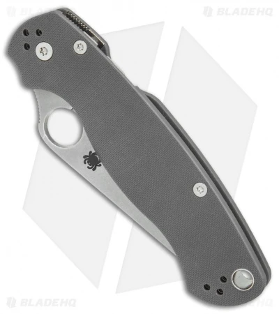 - Fine-textured G-10 handle scales in gray over stainless steel liners.