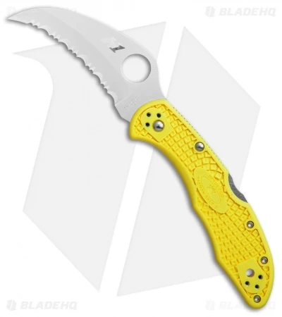 This Tasman Salt 2 knife has a yellow FRN handle and a rustproof H-1* steel blade with a serrated cutting edge.