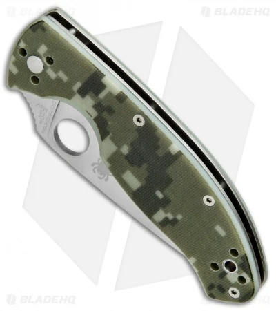 The mid-sized Spyderco Tenacious C122GPCMO has a satin finished blade with a plain edge and a Blade HQ exclusive camo G-10 handle, milled with prolonged fatigue-free cutting in mind. Tucked inside are skeletonized steel liners increasing the handle’s rigidity and strength without adding non-functioning weight or bulky thickness.